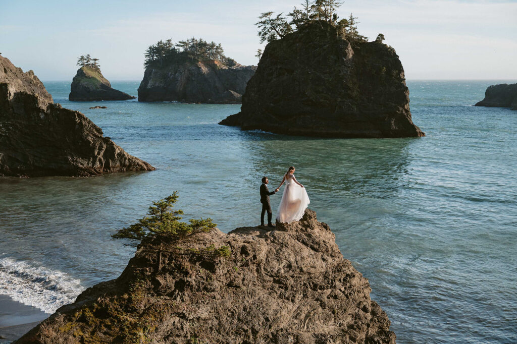 The Oregon Coast is perfect if you’re drawn to something moody and cinematic. Think fog rolling in, waves crashing, and wide open beaches with dramatic rock formations. It’s one of the most iconic places to elope in Oregon, especially for couples who love that coastal, adventurous feel.